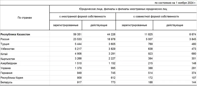По состоянию на 1 ноября 2024 года наибольшее количество зарегистрированных филиалов иностранных юридических лиц приходится на Алматы (12,1%), Астану (11,7%) и Карагандинскую область.