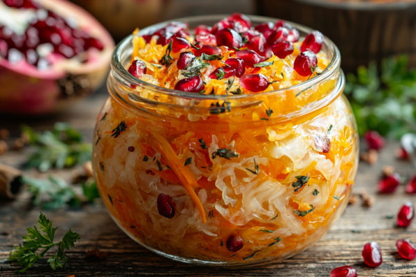 Кислинка квашеной капусты и сладковато-терпкие гранатовые зерна создают идеальный дуэт. Морковь добавляет ноту сладости, а соль выстраивает между ними баланс. Получается не просто заготовка, а готовый, сложный и очень полезный салат.
