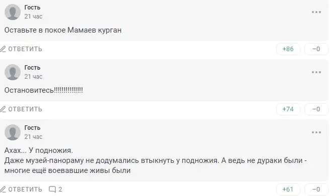 Масштабный проект вызвал беспокойство многих волгоградцев, которые сочли неуместной установку на мемориале героям Великой Отечественной памятника во славу участников ещё не завершённого конфликта. В Сети стали звучать предложения перенести комплекс в честь ветеранов СВО в другое место.