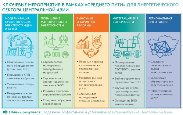 "Средний путь" – это экономическая и технологическая стратегия, позволяющая Центральной Азии сочетать надежность традиционной энергетики и экологичность новых технологий. Использовать все доступные источники – от солнца и ветра до газа, гидро- и атомной энергии. Активно развивать ВИЭ, но при этом не забывать об обновлении традиционных электростанций, развитии новых сетей, накопителей энергии и запуске полноценной региональной торговли. Такой гибкий подход обеспечит региону прочную основу для экономического роста".