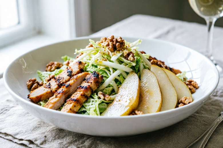 Если хочется подать на праздник что-то лёгкое, яркое и небанальное, этот салат станет настоящим спасением. Необычное сочетание копченой курицы, сладкой груши и орехов делает блюдо сочным, свежим и очень нарядным без тяжелого майонеза.