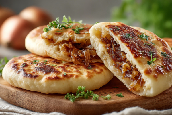 Способ приготовления: замесите тесто из муки, воды, масла и соли. Оно должно быть эластичным и не липнуть к рукам. Накройте плёнкой и оставьте на 30 минут. Лук нарежьте тонкими полукольцами и обжарьте на растительном масле до золотистого цвета и мягкости, посолите и поперчите. Остудите. Тесто разделите на 8-10 частей. Каждую раскатайте в тонкую лепешку. На половину лепешки выложите слой жареного лука, накройте второй половиной, защипните края. Можно также раскатать две лепешки, выложить на одну начинку и накрыть второй. Обжарьте лепешки на сухой сковороде с двух сторон до золотистых пятен.