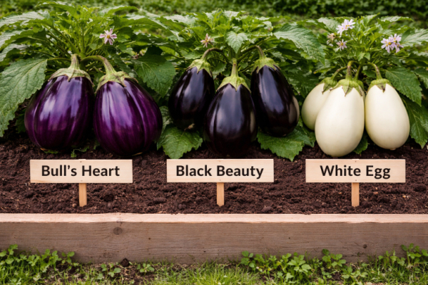 Ещё один интересный вариант — «Белое яйцо». Этот сорт отличается необычным светлым цветом плодов и мягким, деликатным вкусом без горечи, отлично подходит для запекания и жарки.