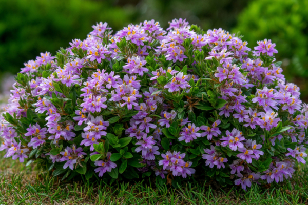 Цветение сцеволы невероятно обильное и продолжительное: с июня до самых заморозков куст буквально усыпан цветками, каждый из которых держится до двух недель, а палитра включает небесно-голубые, сиреневые, фиолетовые, розовые и белые оттенки.
