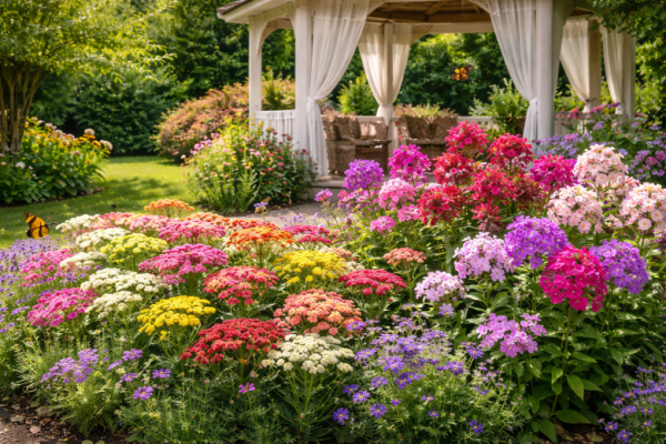 Тысячелистник радужный — выносливый многолетник высотой около 60 см с ажурной листвой и крупными щитковидными соцветиями до 10–12 см. Окраски бывают от белых до бордовых и жёлтых. Обладает пряным степным ароматом, активно привлекает бабочек и пчёл. Зимостойкость до –35 °C, живёт на одном месте 5–7 лет. Интересный факт: тысячелистник улучшает рост соседних растений и подходит для сухих букетов.